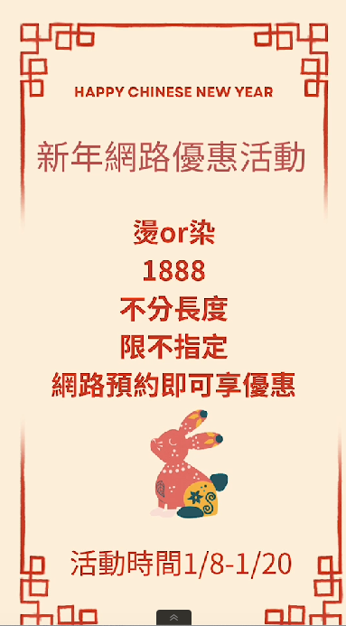 【 UN團隊 新年網路優惠活動 】 迎接兔年~用新髮型,來點迷人新氣象吧! 燙 or 染 只需 1888(不分長度 ) 不指定設計師 網路預約即可享優惠,日期 1/8-1/20 水水帥哥們快來改造時尚新造型!